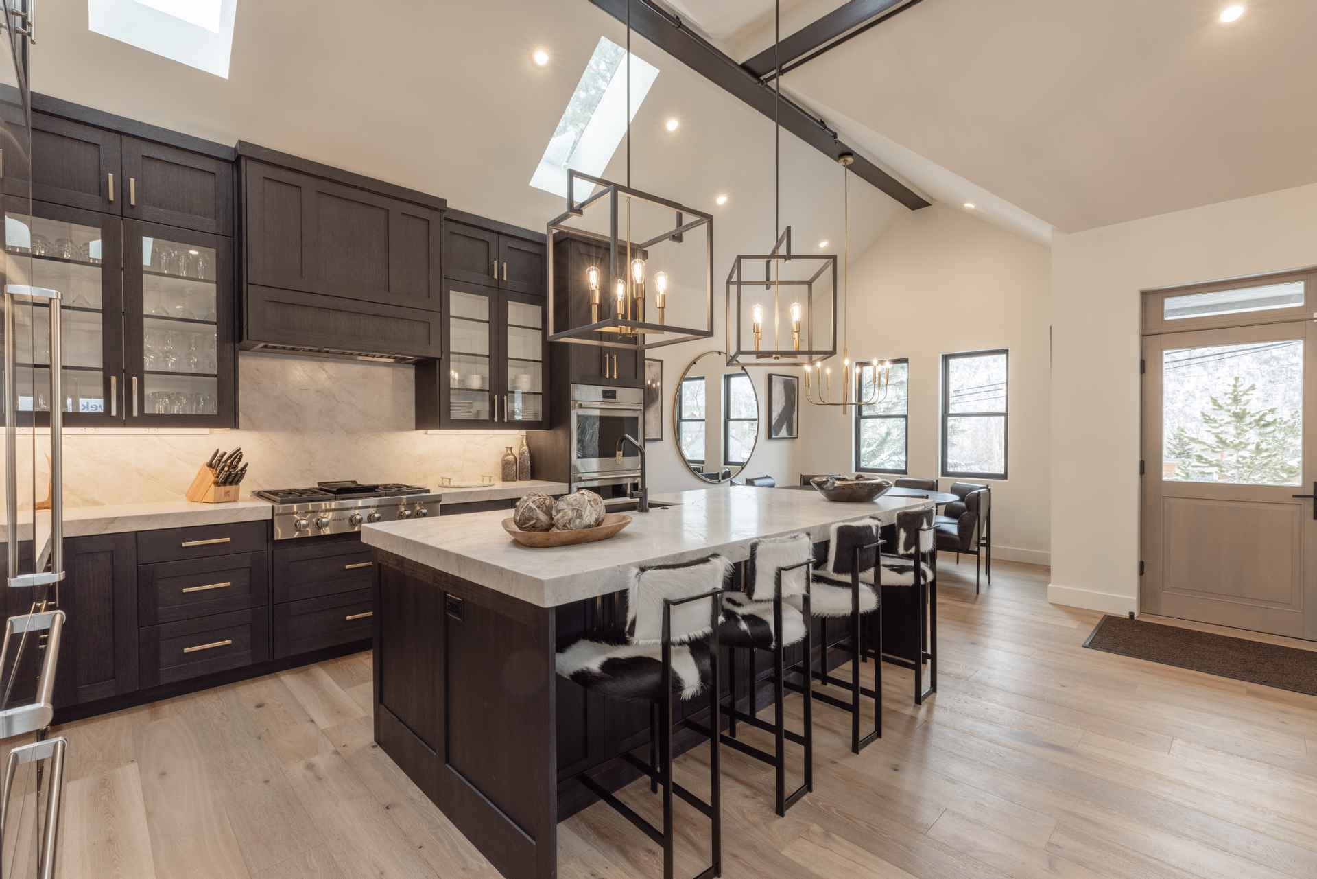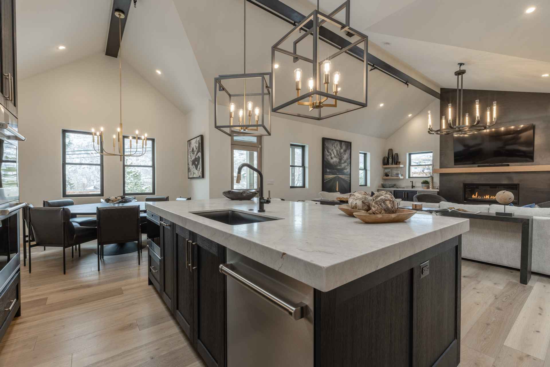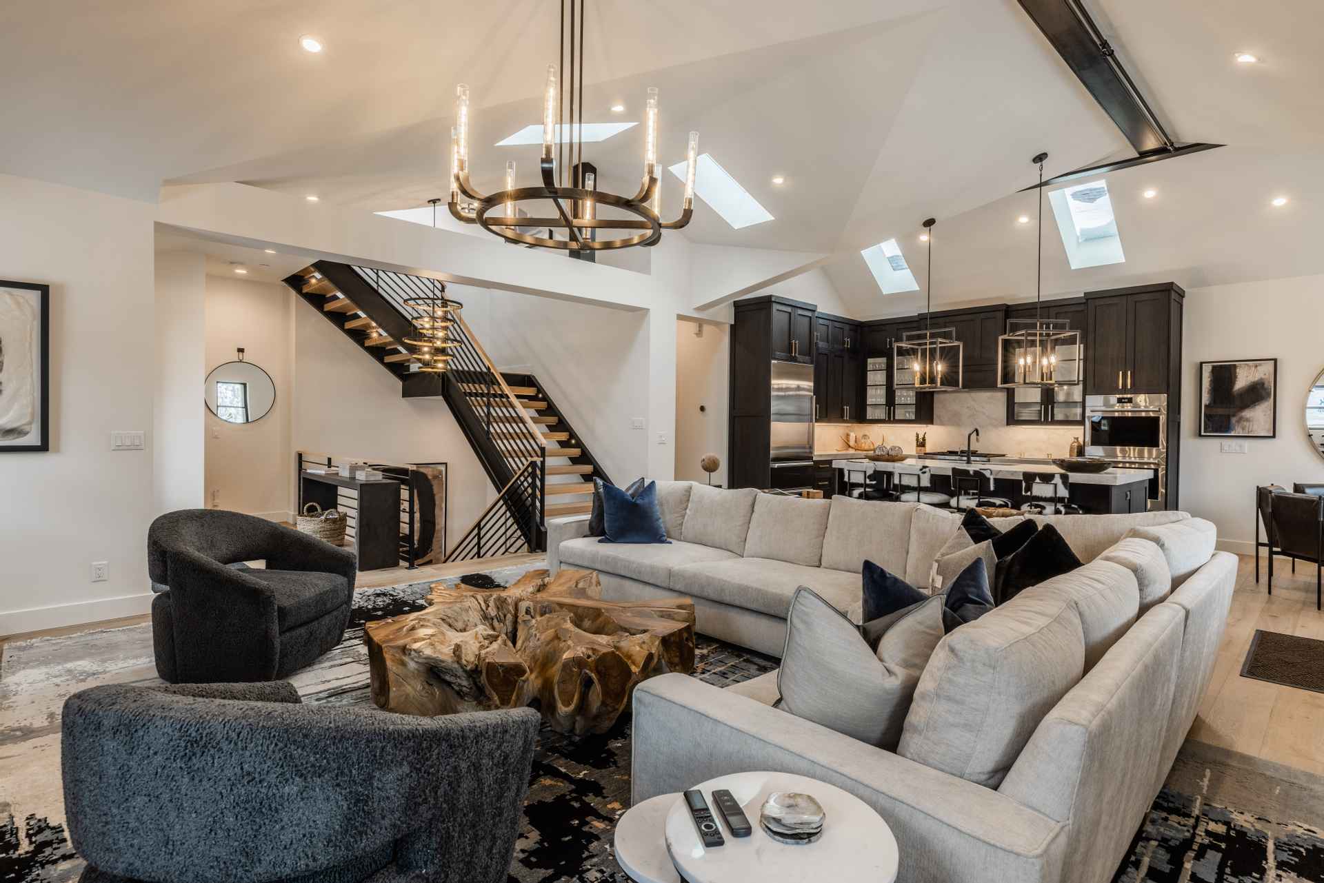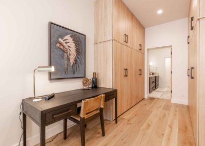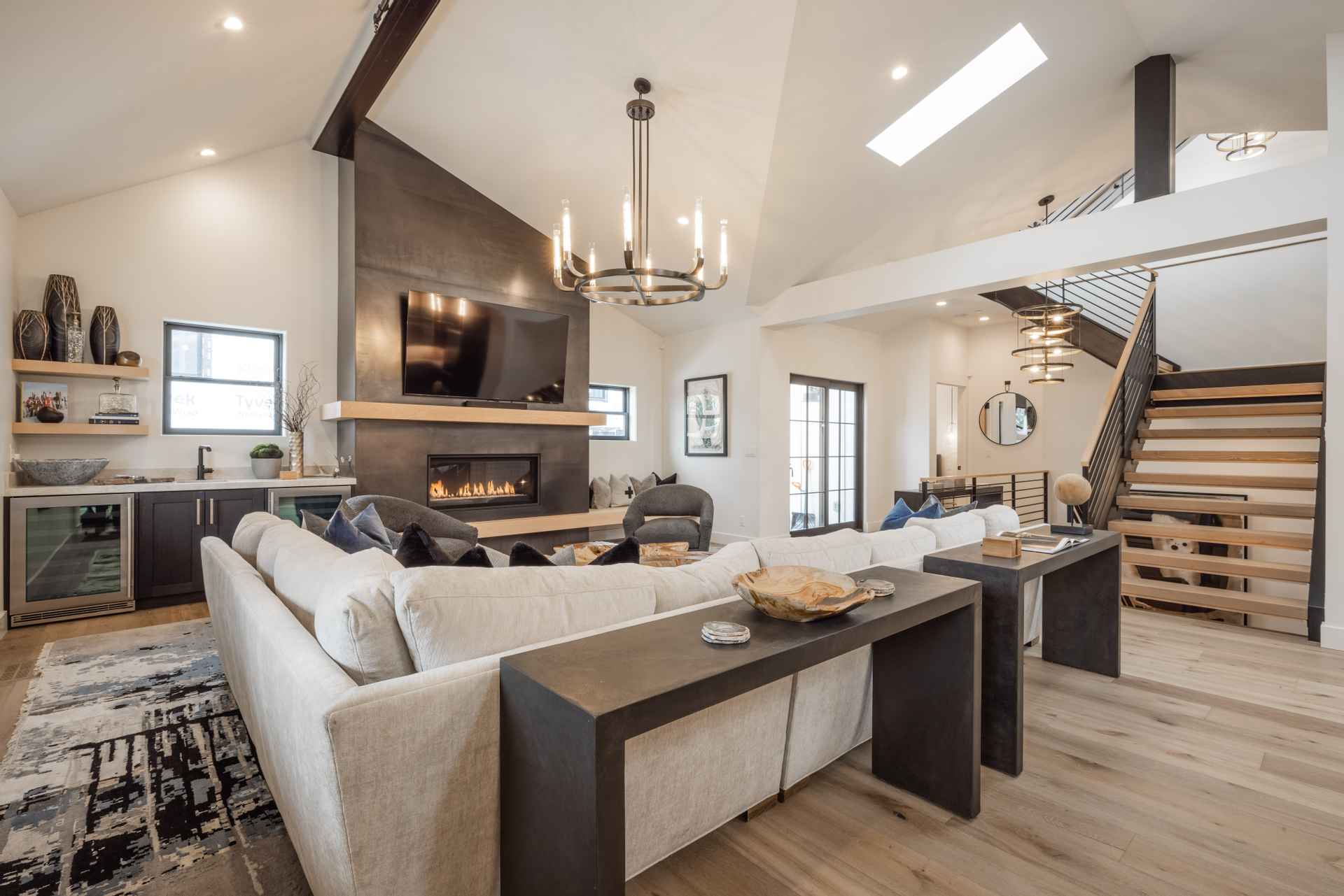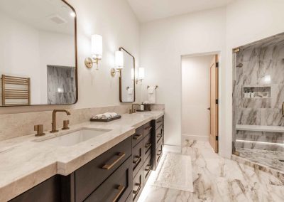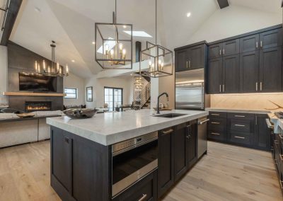 The inviting great room has soaring ceilings and one of the home’s three gas fireplaces. The living space flows into a sleek gourmet kitchen and butler’s pantry, and a cozy dining space. The main floor also features a spacious primary bedroom with a spa-like en suite bathroom and a large closet.