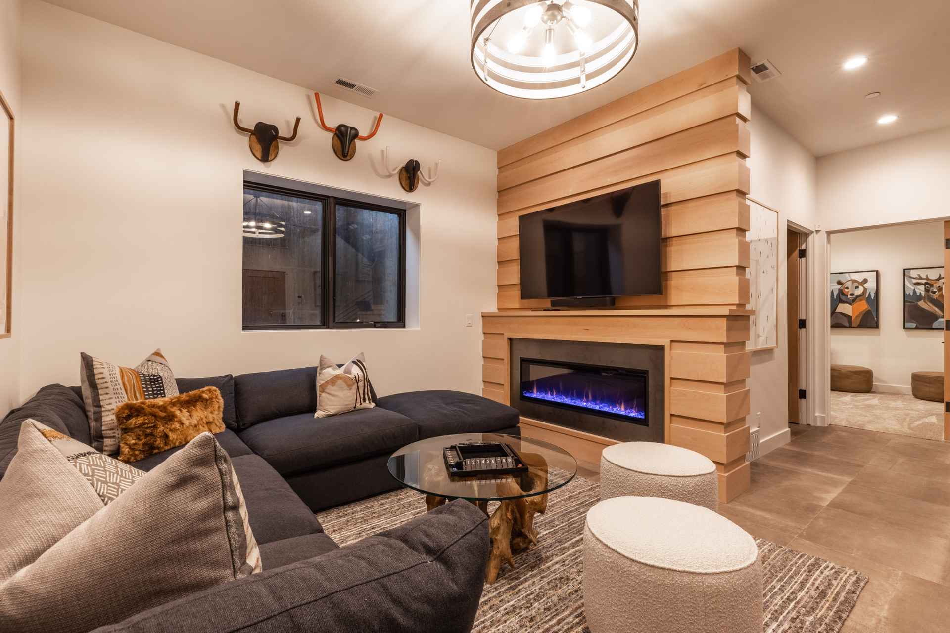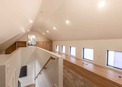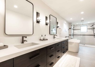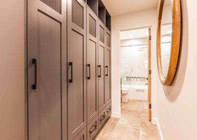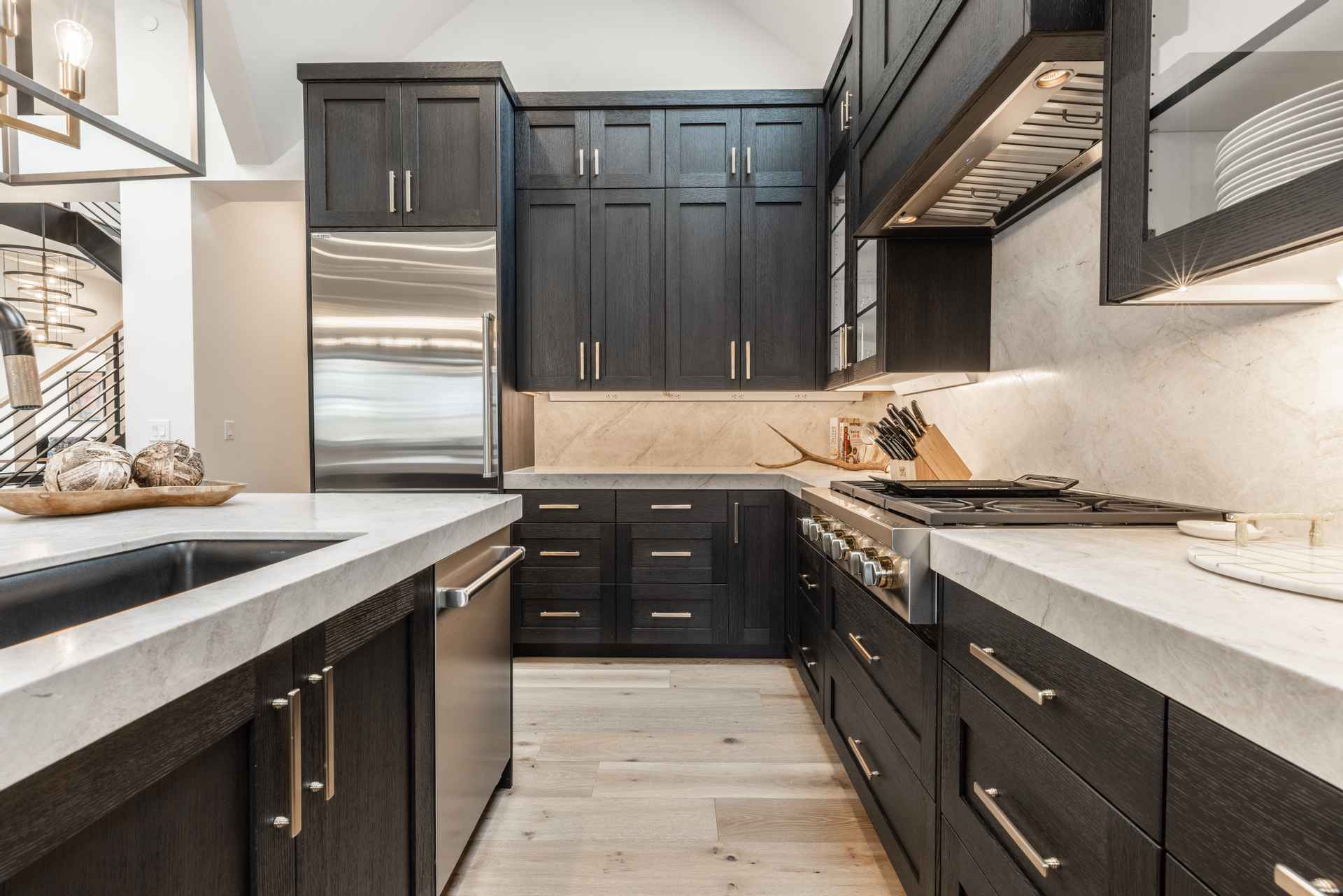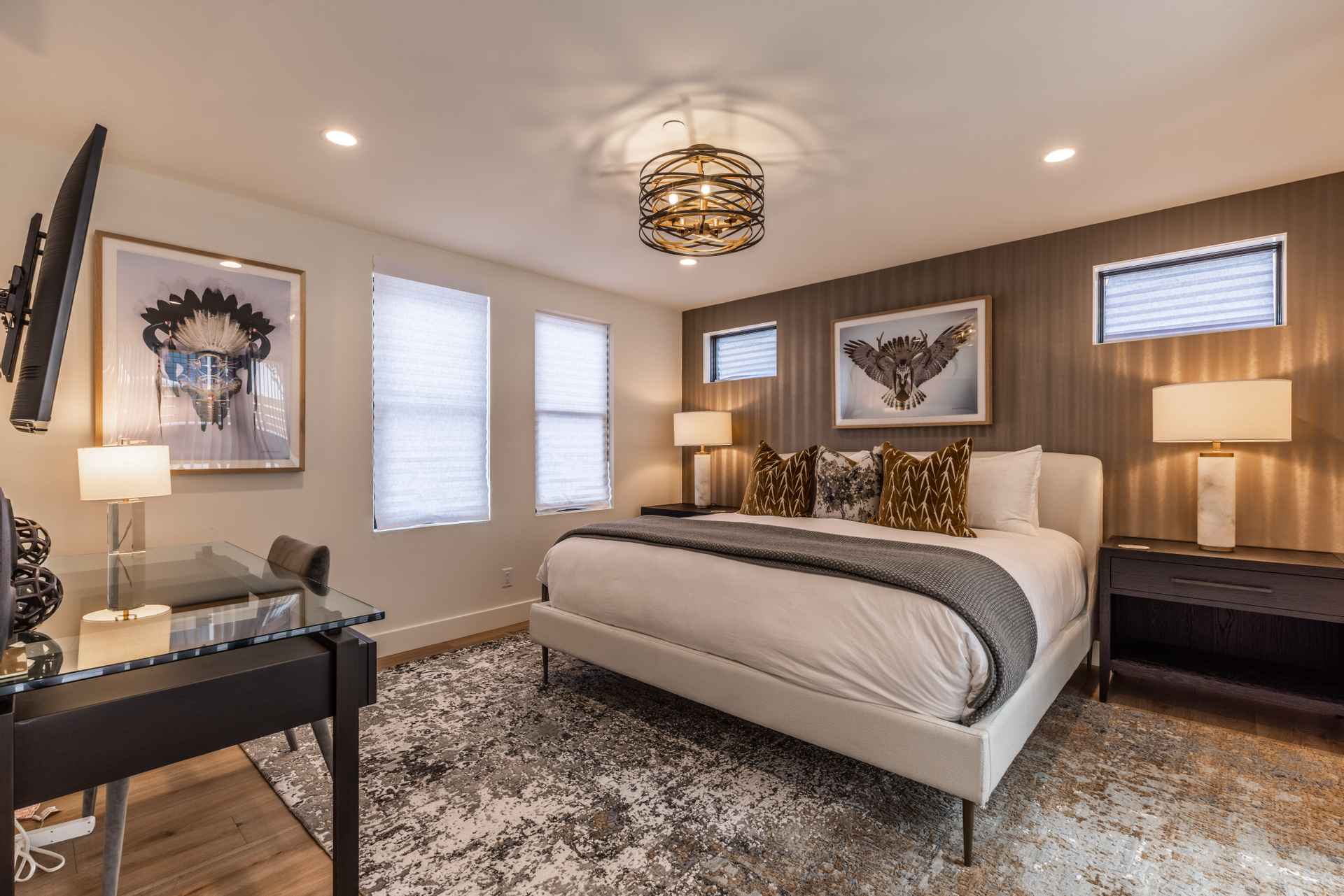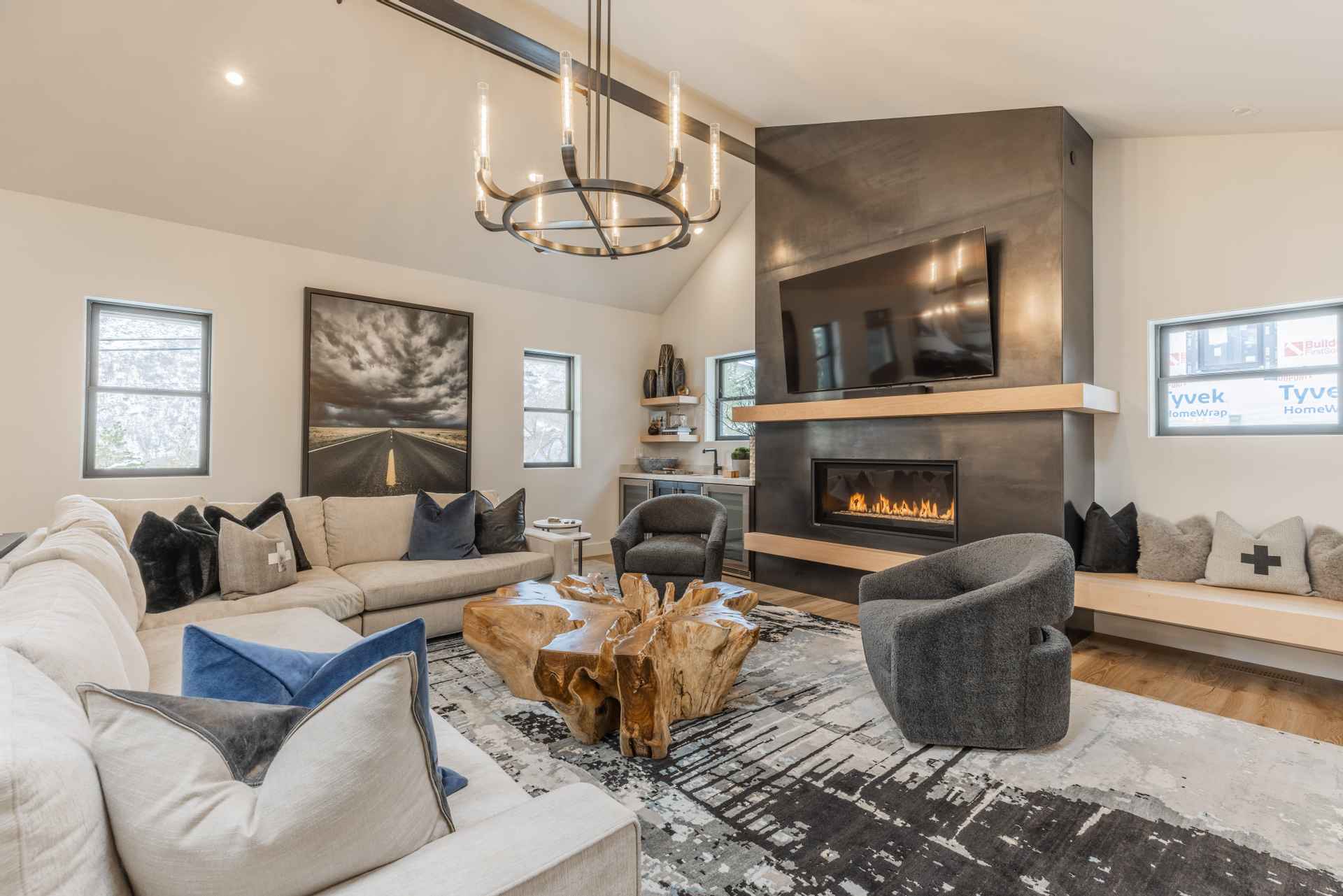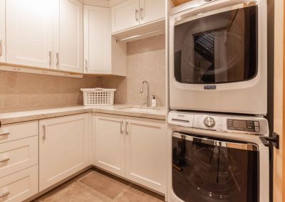 The inviting great room has soaring ceilings and one of the home’s three gas fireplaces. The living space flows into a sleek gourmet kitchen and butler’s pantry, and a cozy dining space. The main floor also features a spacious primary bedroom with a spa-like en suite bathroom and a large closet.