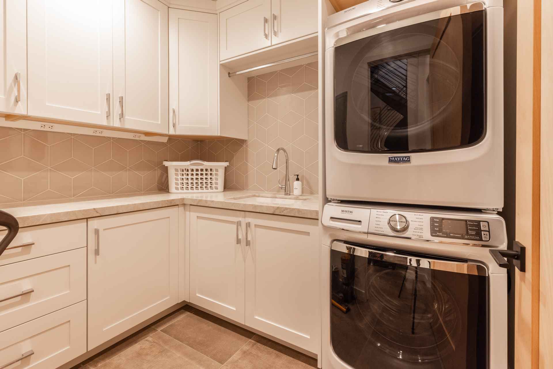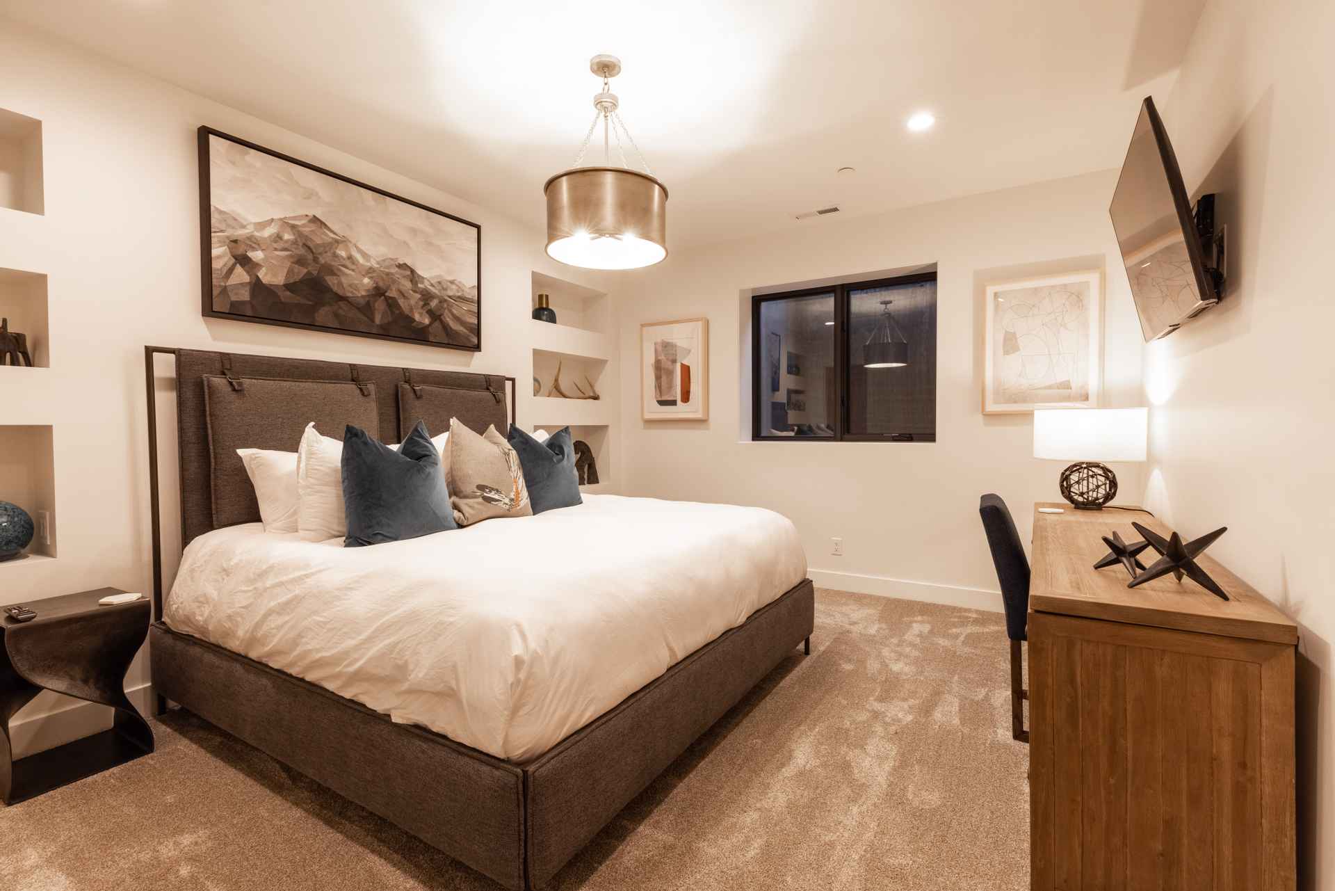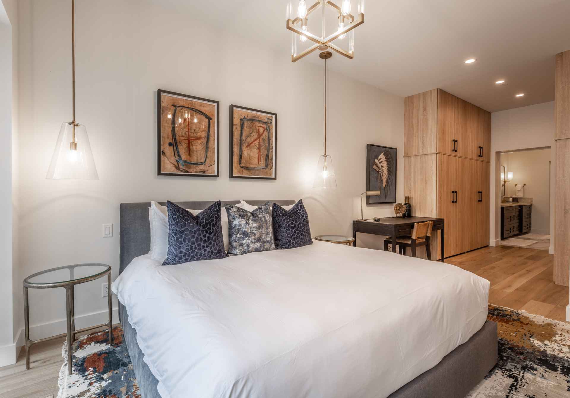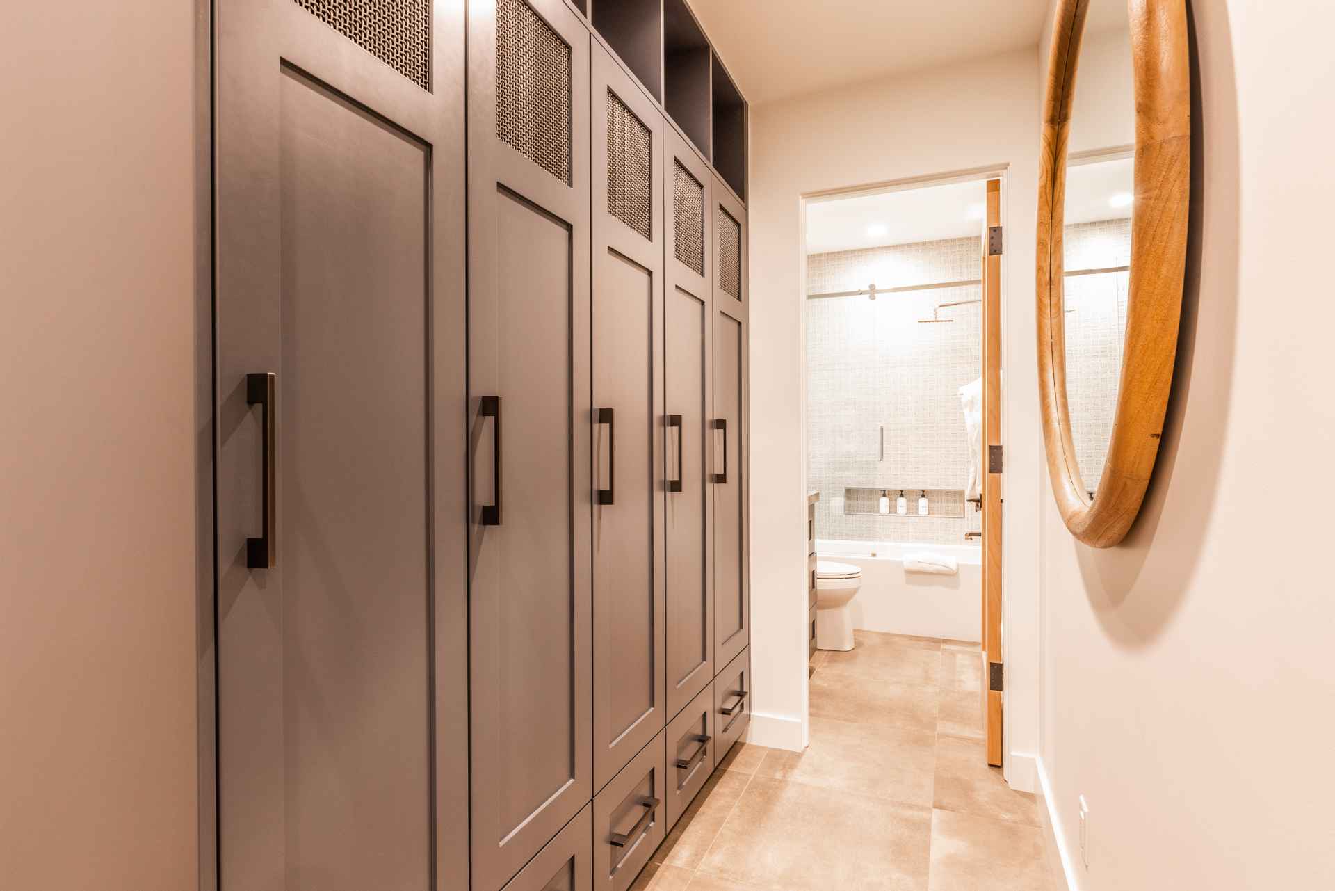 The inviting great room has soaring ceilings and one of the home’s three gas fireplaces. The living space flows into a sleek gourmet kitchen and butler’s pantry, and a cozy dining space. The main floor also features a spacious primary bedroom with a spa-like en suite bathroom and a large closet.