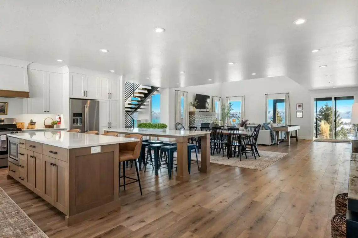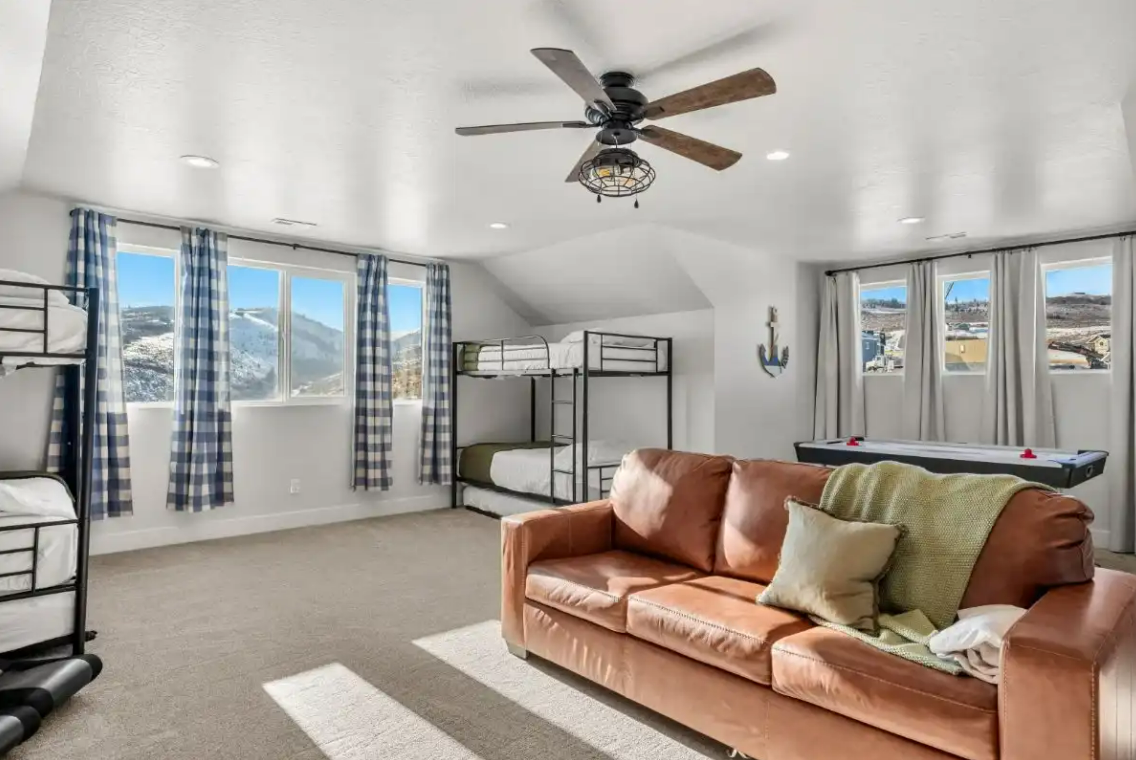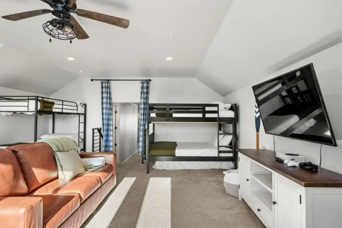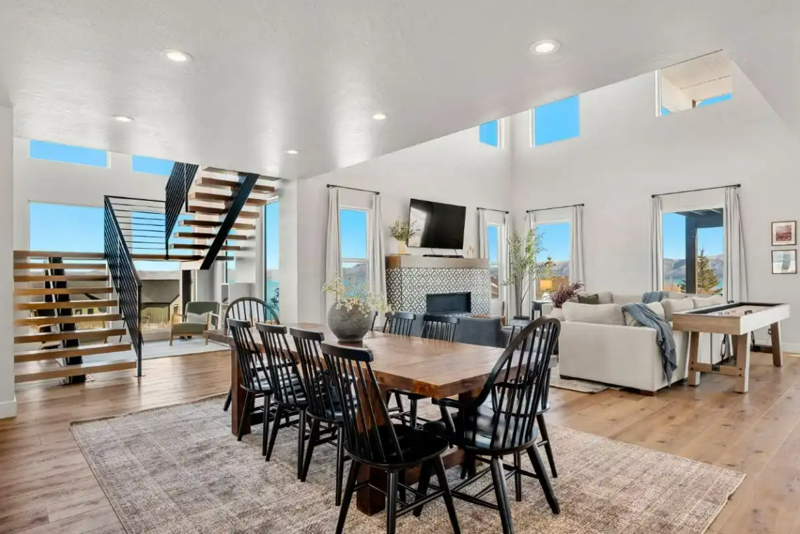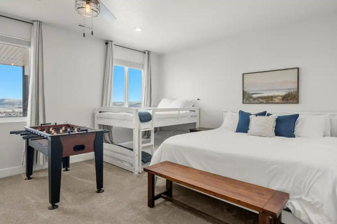 Raspberry Retreat is perfect for large families or groups, with spacious accommodations featuring six bedrooms and five bathrooms. You can enjoy plenty of room to relax, plus amenities like a private hot tub, pickleball court, and easy access to Bear Lake’s outdoor activities can make for an unforgettable vacation experience.