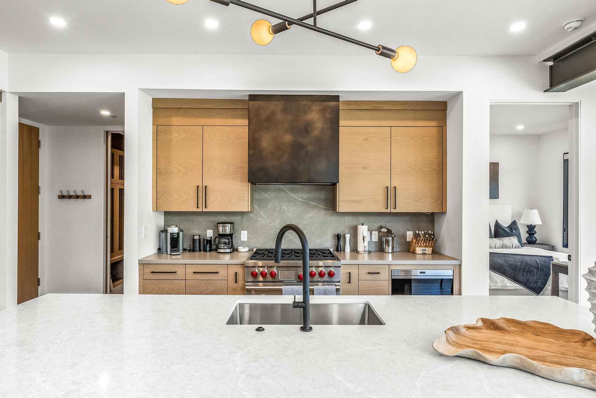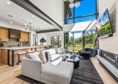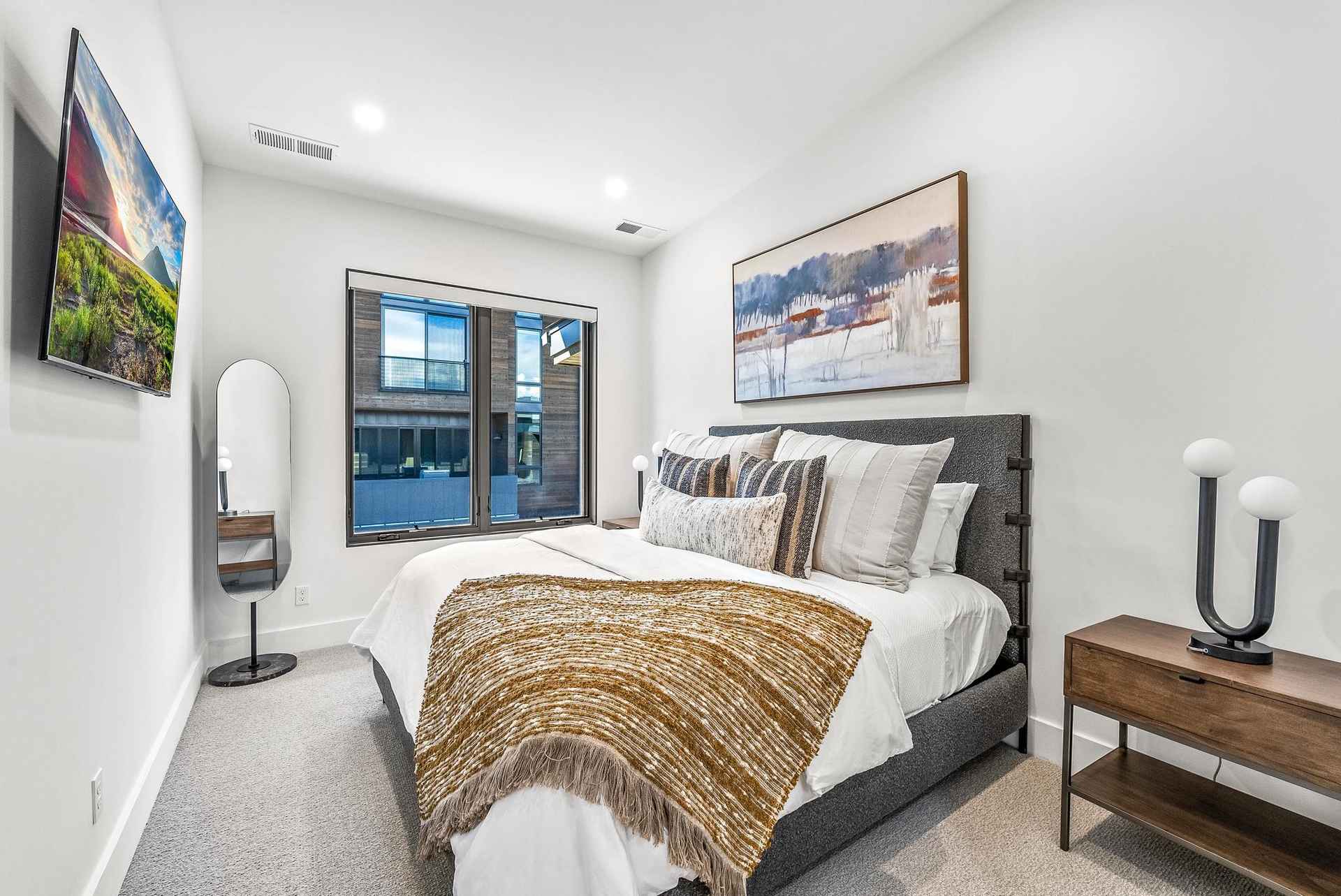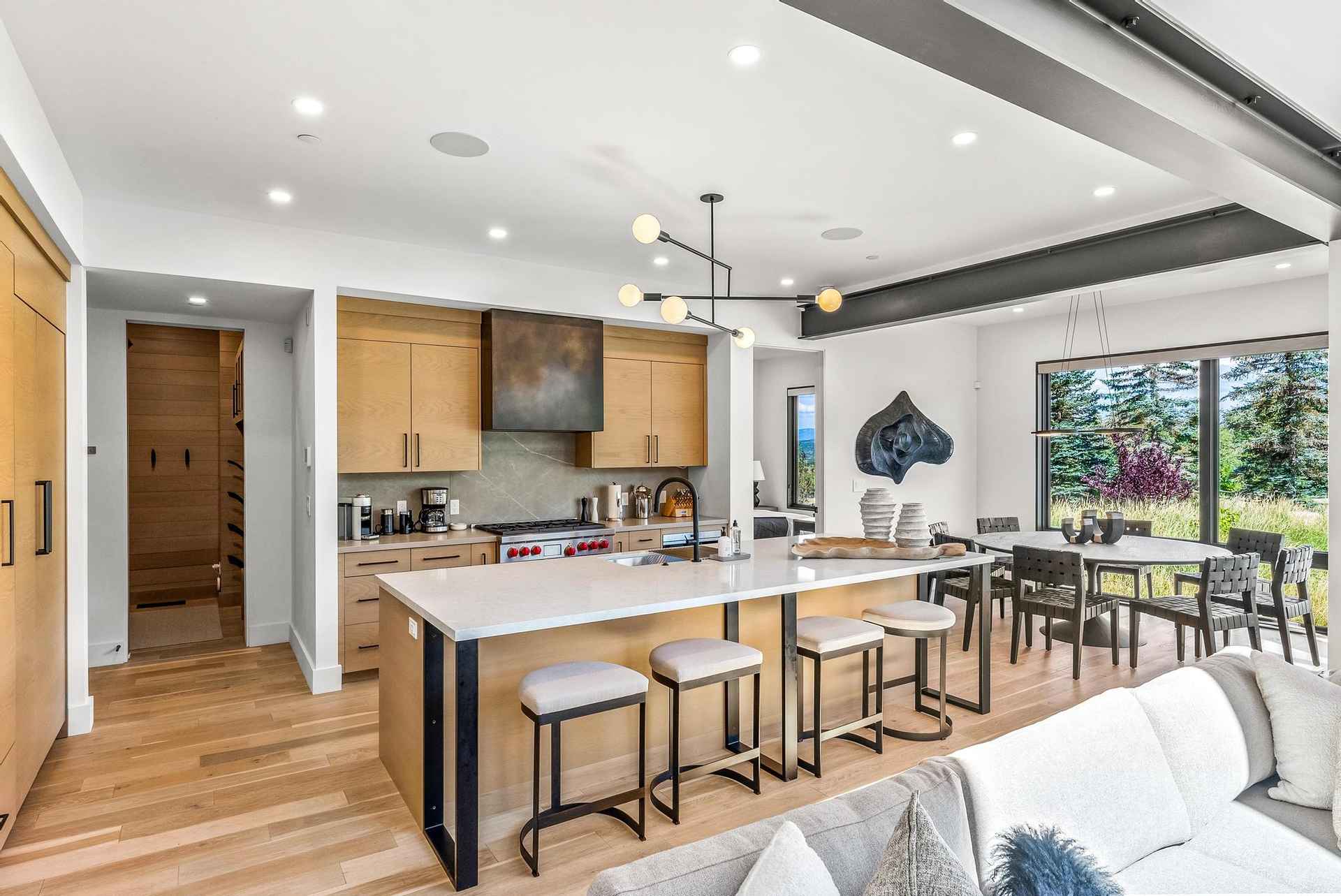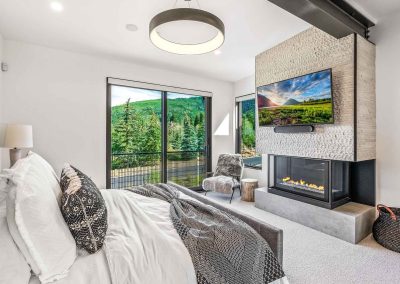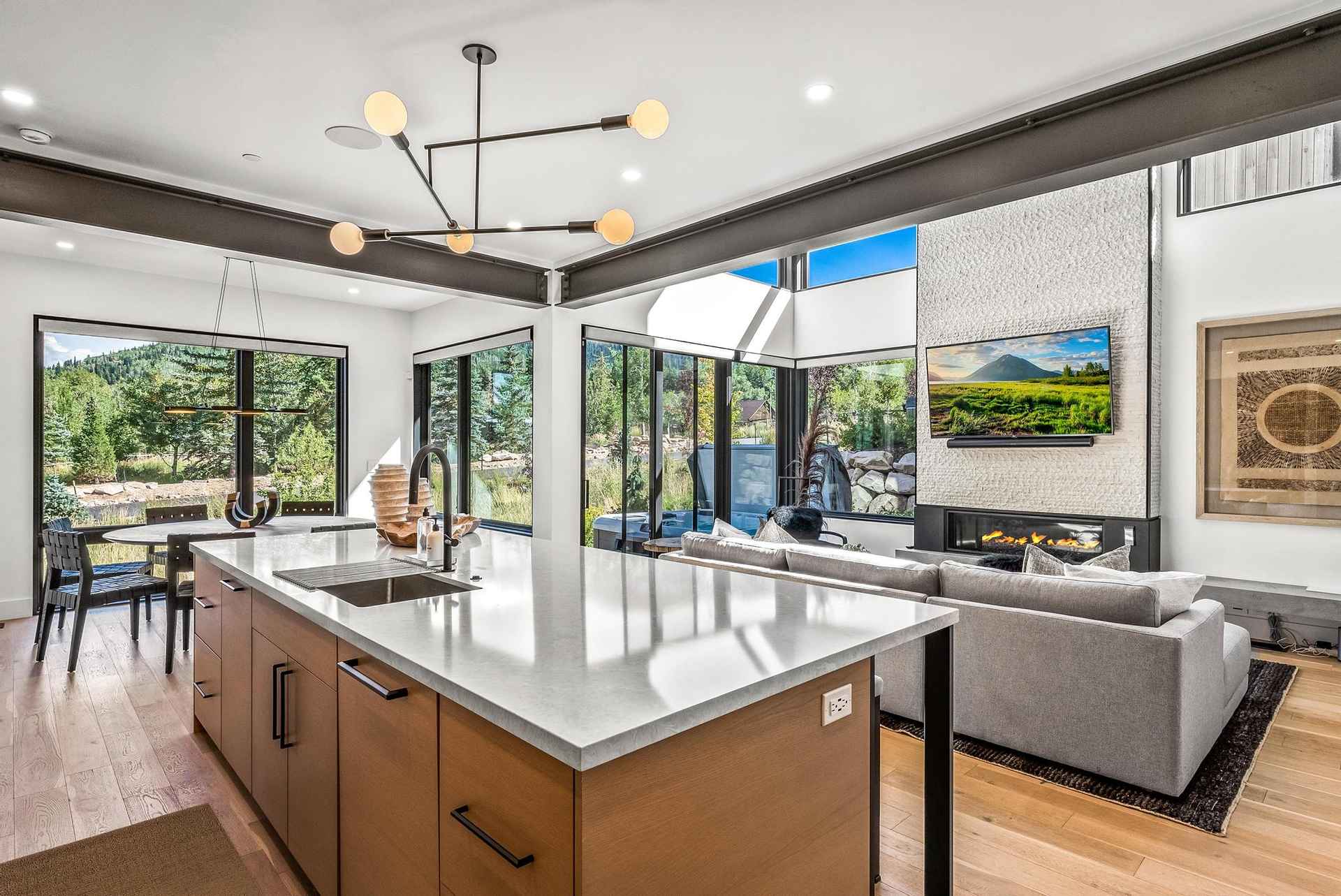 Enjoy unobstructed views of Iron Mountain from Red Pine, a spacious new construction townhouse with an open plan design. The home’s modern vibe starts with a double-height fireplace and a window wall that opens to the patio and hot tub. The gourmet kitchen features stainless steel appliances and a large island with seating. The adjoining dining area is washed in sunlight and mountain views. A bedroom, bathroom and ski storage area round out the main floor.