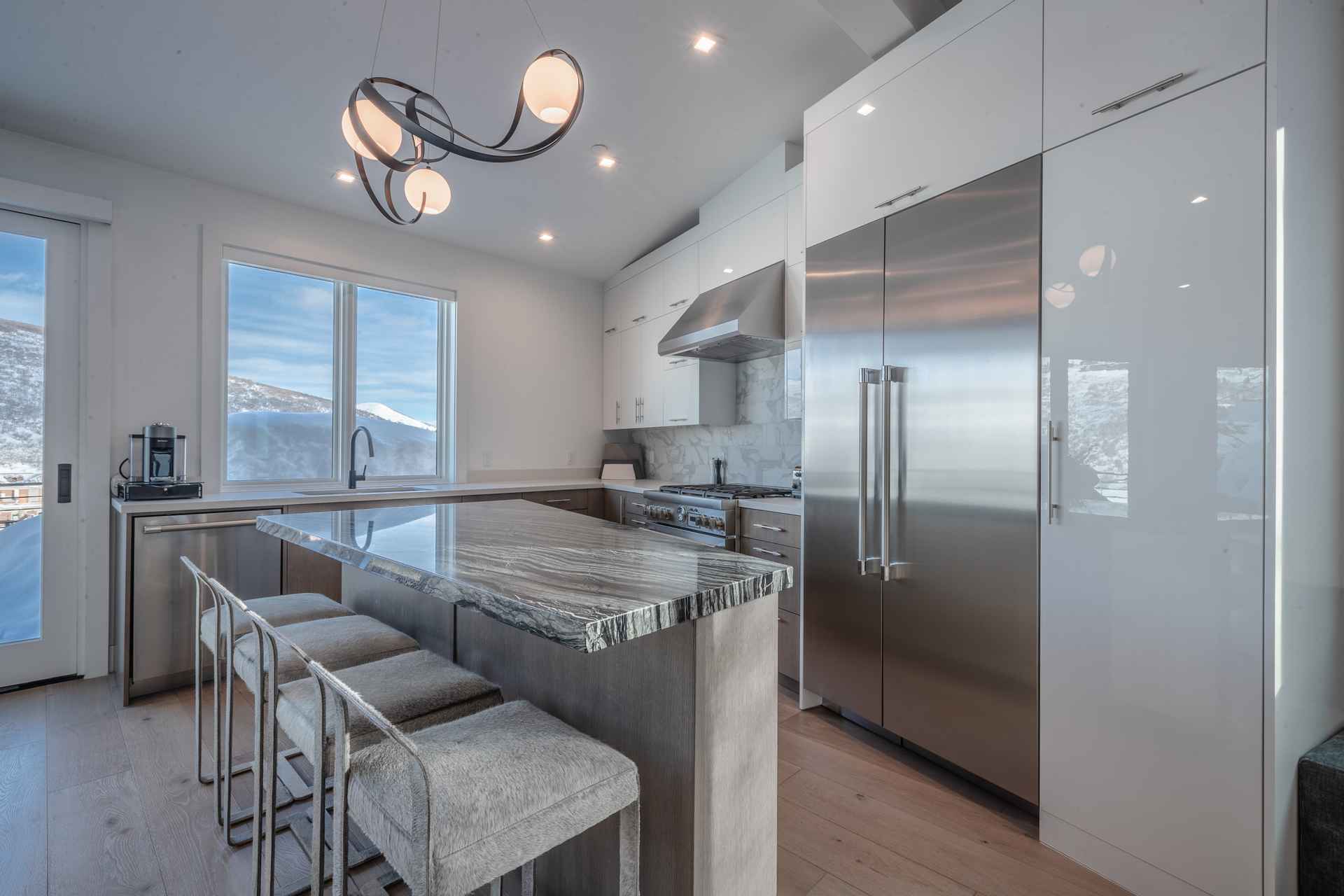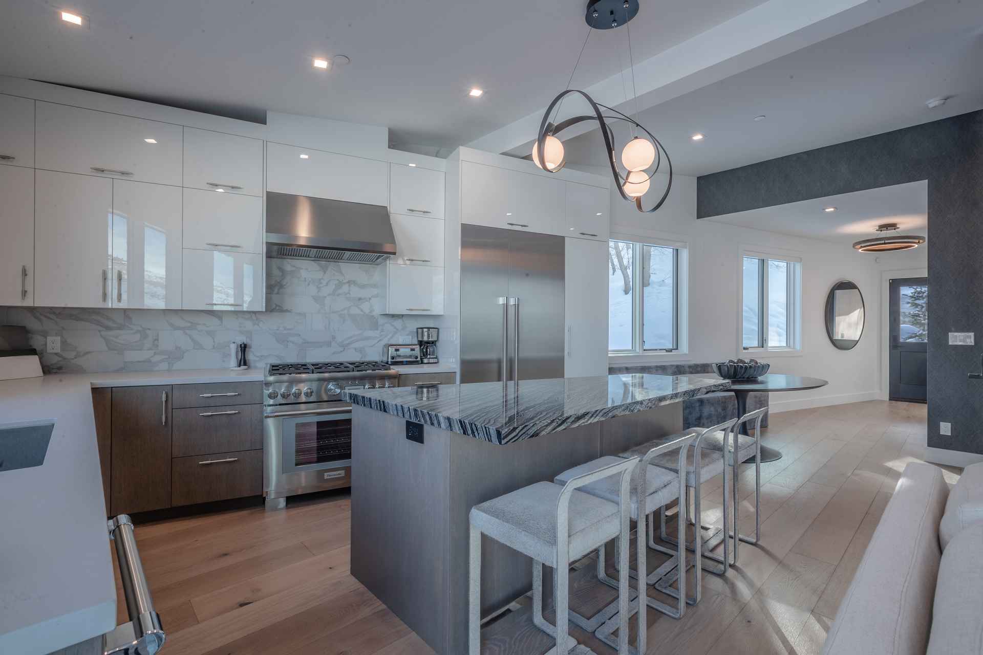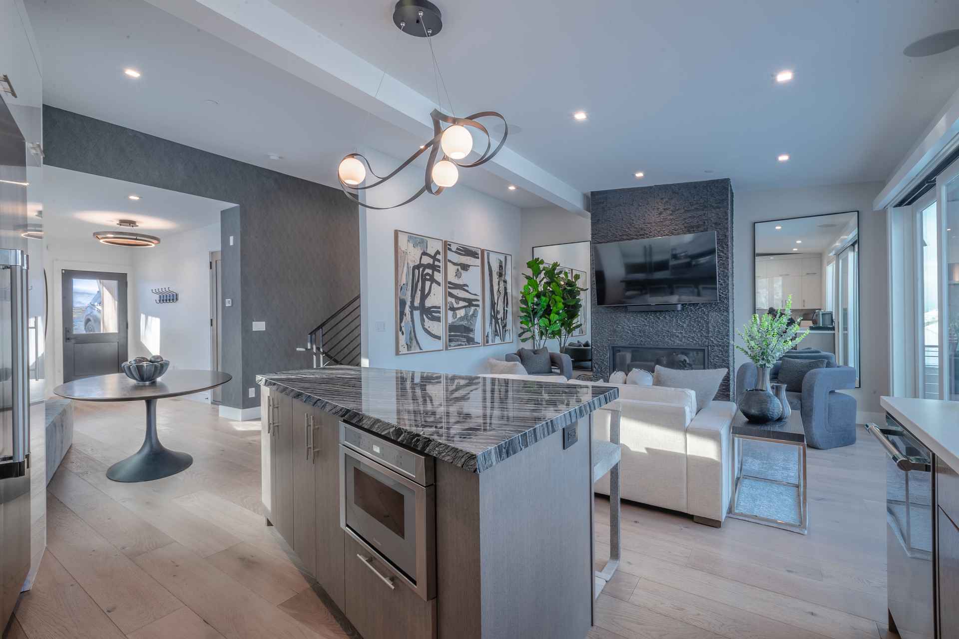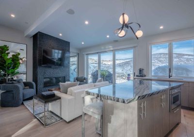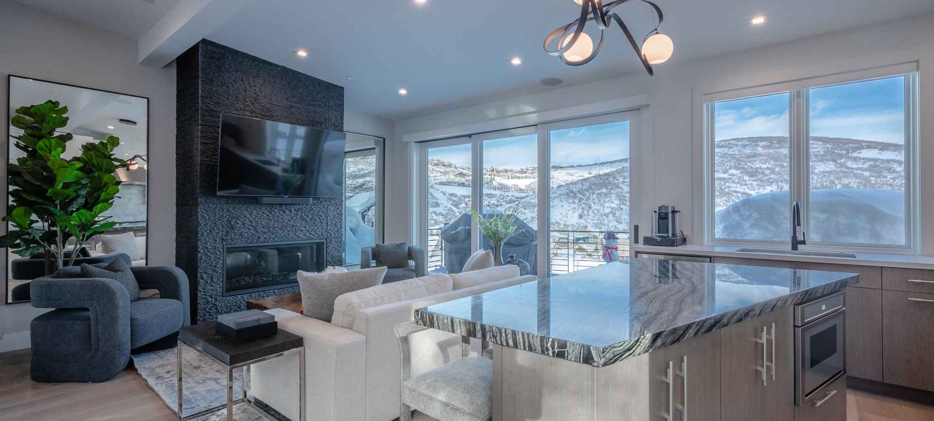 A sleek fireplace anchors the open plan great room, with doors leading to a deck with mountain views. The adjoining kitchen offers high-end appliances and a central island for prep and eating.