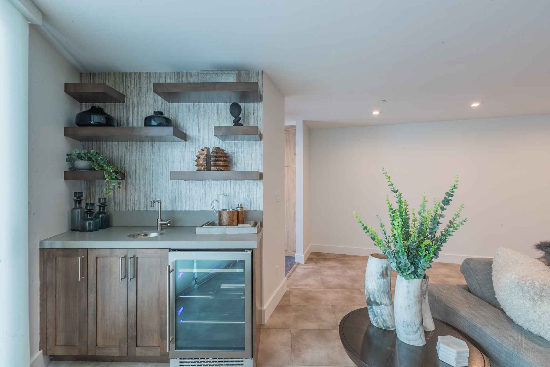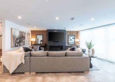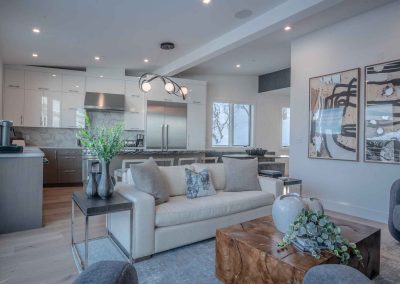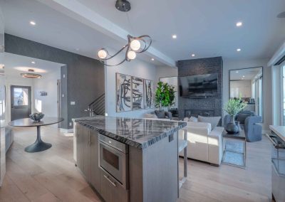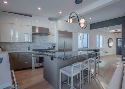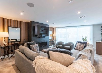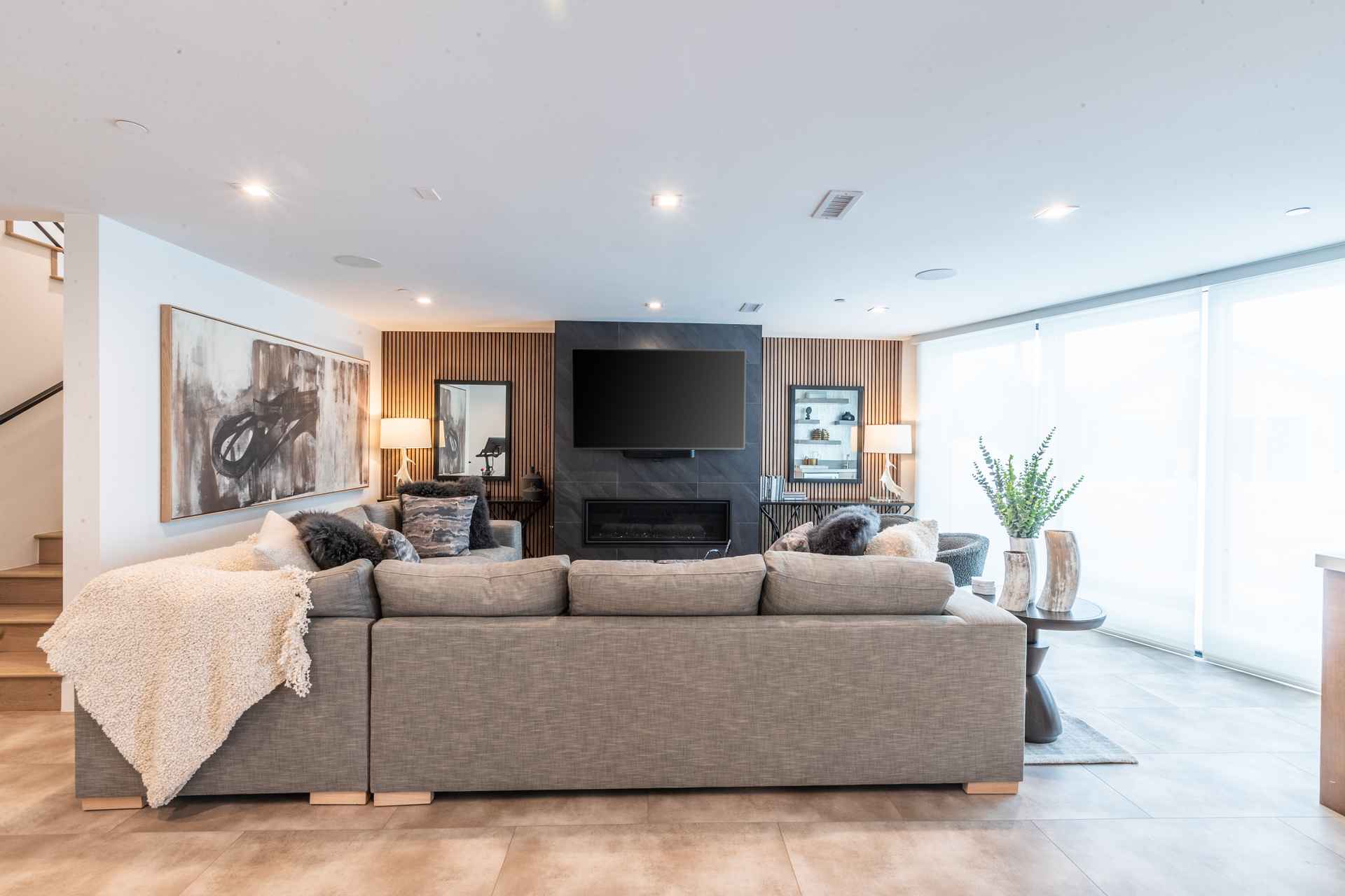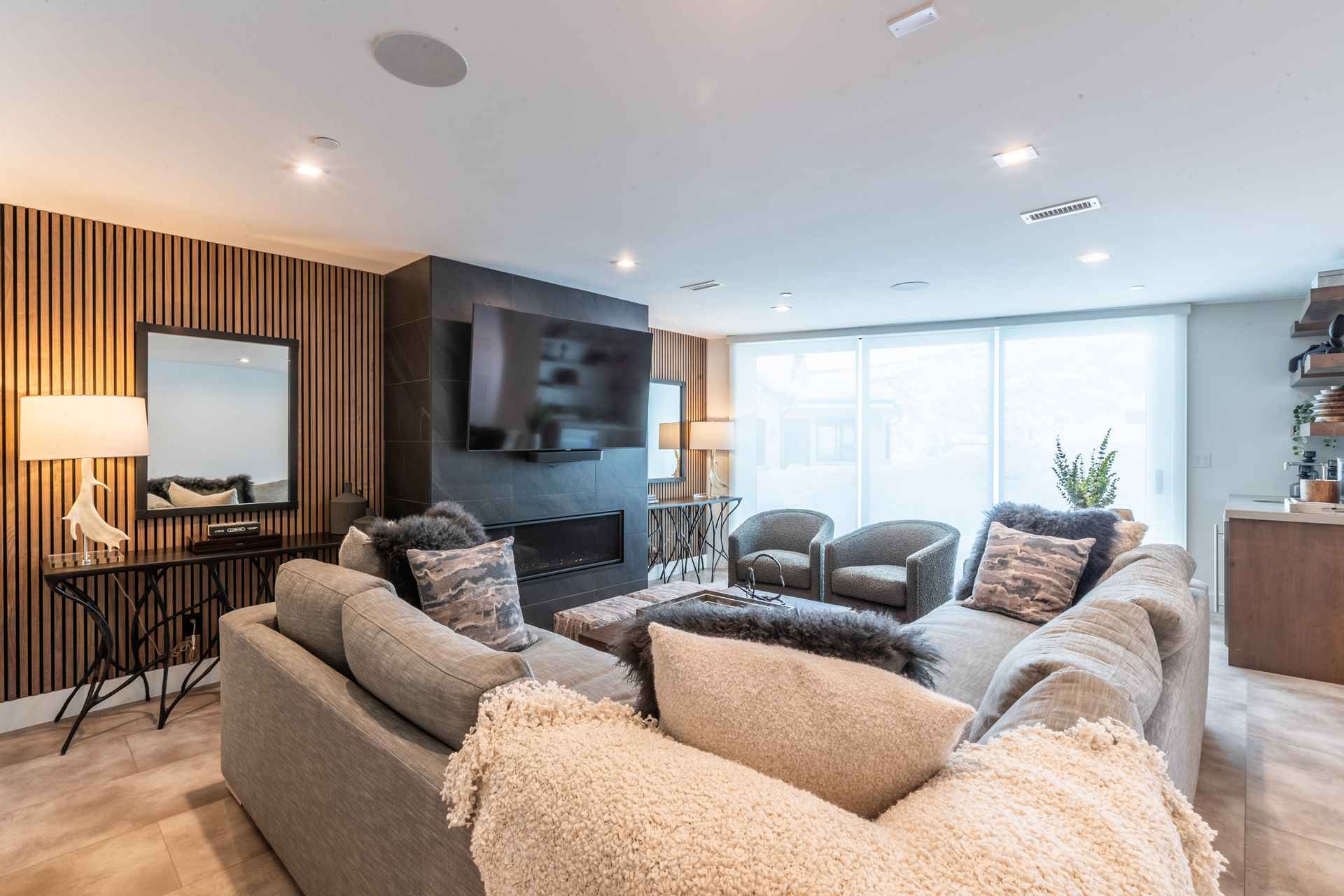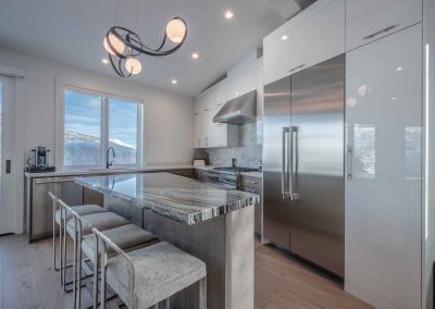 A sleek fireplace anchors the open plan great room, with doors leading to a deck with mountain views. The adjoining kitchen offers high-end appliances and a central island for prep and eating.