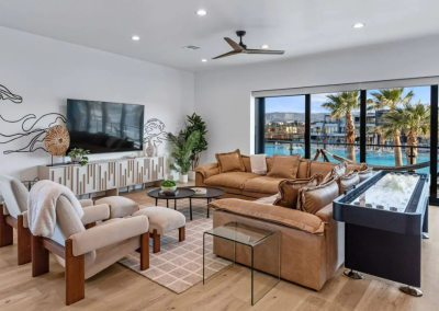 Modern Lagoon stands as your ultimate beachfront haven in the heart of the sought-after Desert Color Community in St. George, UT. This fully furnished vacation home boasts 7 bedrooms, 10 bathrooms, and 3 expansive gathering areas spread across three levels, offering an unparalleled blend of luxury and coastal living.
