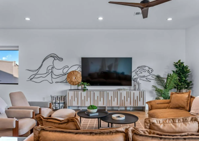 Modern Lagoon offers an array of luxurious amenities, including a private pool and hot tub. The home features a home theater, arcade games, ping pong, air hockey, shuffleboard, and other board games. Outdoors, you’ll find beach volleyball, spike ball, and access to the Desert Color lagoon.