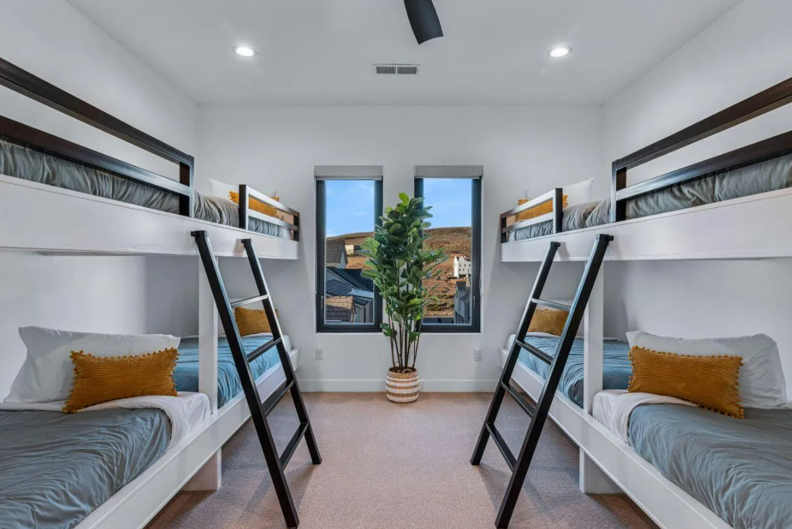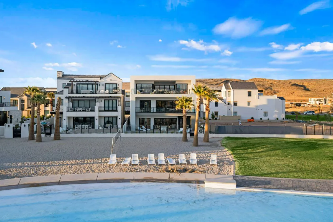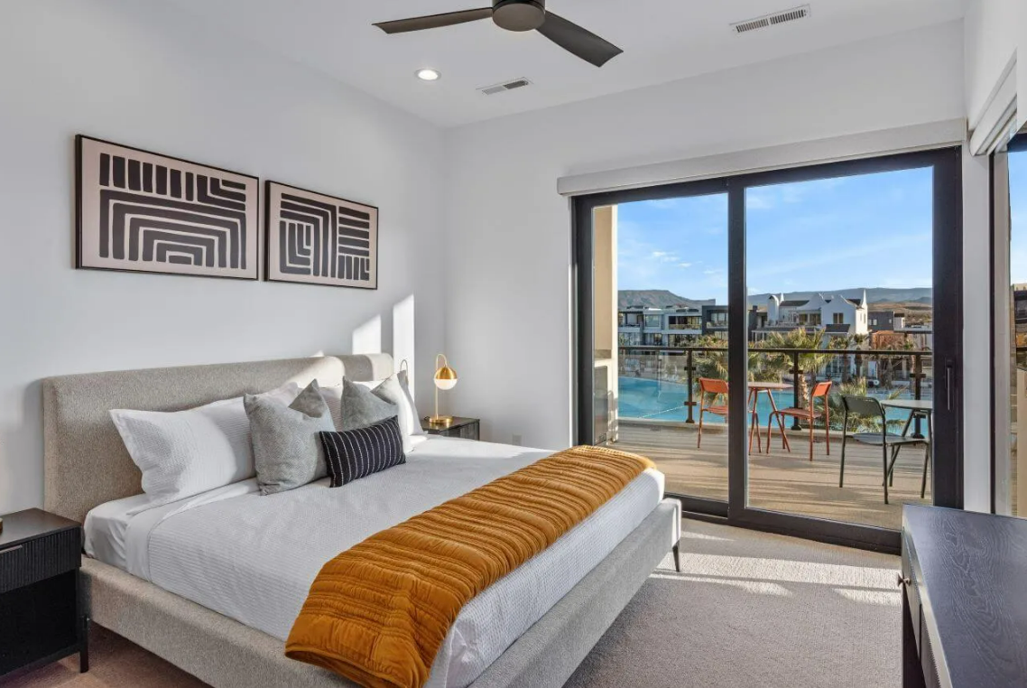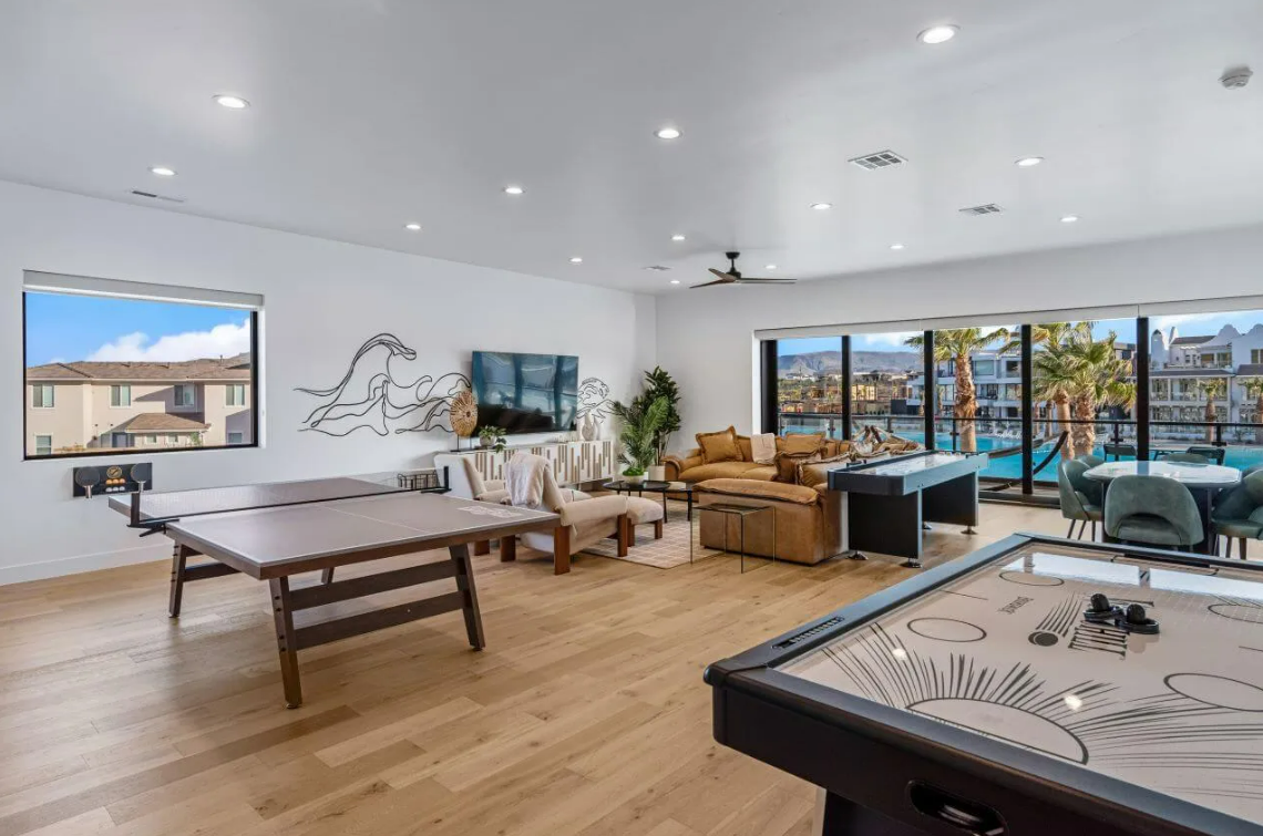 Modern Lagoon stands as your ultimate beachfront haven in the heart of the sought-after Desert Color Community in St. George, UT. This fully furnished vacation home boasts 7 bedrooms, 10 bathrooms, and 3 expansive gathering areas spread across three levels, offering an unparalleled blend of luxury and coastal living.
