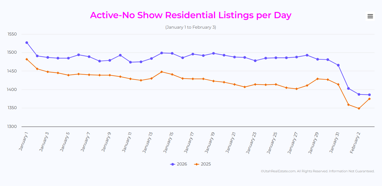 Active-No Show listings represent properties that are not actively being marketed or shown, either for a temporary period of time or for the remaining duration of the listing agreement.