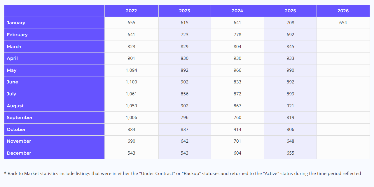 Back to Market statistics include listings that were in either the ‘Under Contract’ or ‘Backup’ statuses and returned to the ‘Active’ status during the time period reflected.